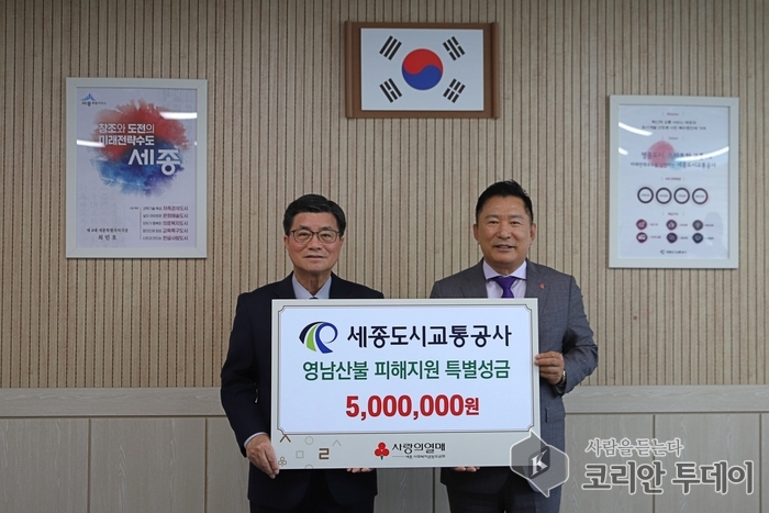 세종도시교통공사가 최근 산불로 큰 피해를 입은 영남지역 주민들을 위해 성금을 기탁하며 따뜻한 연대의 손길을 건넸다. 23일, 공사 측은 도순구 사장을 비롯한 임직원들이 자발적으로 모금한 성금 500만원을 세종시 사회복지공동모금회에 전달했다고 밝혔다. 이번 성금은 영남지역 산불 피해 주민들의 생계 안정과 복구 활동에 사용될 예정이다.