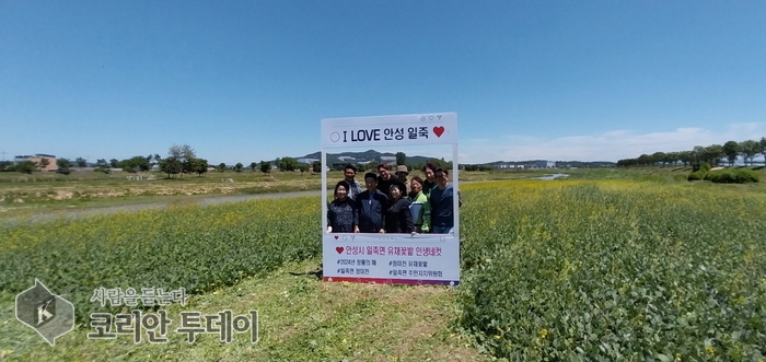 안성시 일죽면 주민자치위원회가 지난 16일 청미천 주차장 옆 산책로변에 조성된 유채꽃밭에 포토존을 설치했다.