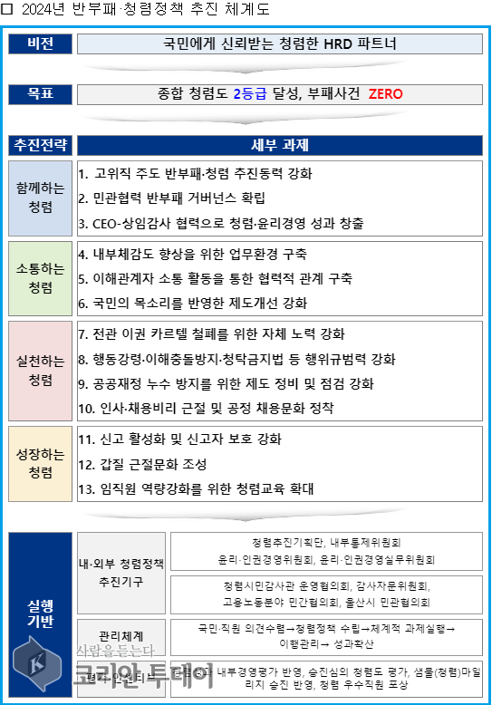 ![]() [코리안투데이] 2024년 반부패, 청렴정책 추진 체계도 © 양정자 기자 |