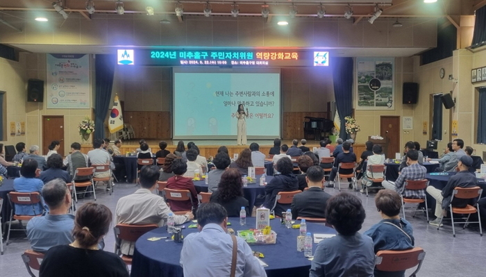 인천 미추홀구(구청장 이영훈)는 22일 구청 대회의실에서 21개 동 주민자치회 위원을 대상으로 ‘성찰과 공감을 통한 건강한 관계 맺기, 소통!’이라는 주제로 역량 강화 교육을 진행했다.