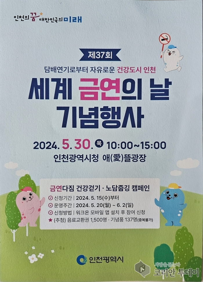 인천광역시는 제37회 세계 금연의 날을 기념하기 위해 5월 30일 목요일 인천광역시청 애뜰광장에서 행사를 개최한다고 발표했다. 이번 행사는 ‘담배연기로부터 자유로운 건강도시 인천’을 목표로, 시민들의 많은 관심과 참여를 독려하고 있다.