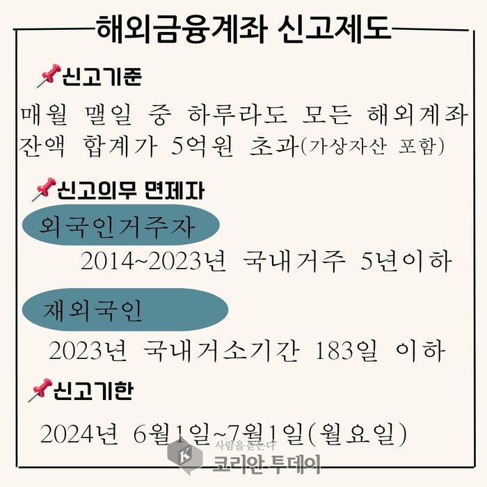 국세청은 5월 30일, 해외금융계좌를 보유한 거주자 및 내국법인이 2023년 매월 말일 중 어느 하루라도 모든 해외금융계좌 내 현금, 주식, 가상자산 등의 잔액을 합산한 금액이 5억원을 초과할 경우, 해당 계좌정보를 6월 1일부터 7월 1일까지 납세지 관할 세무서장에게 신고해야 한다고 발표했다.