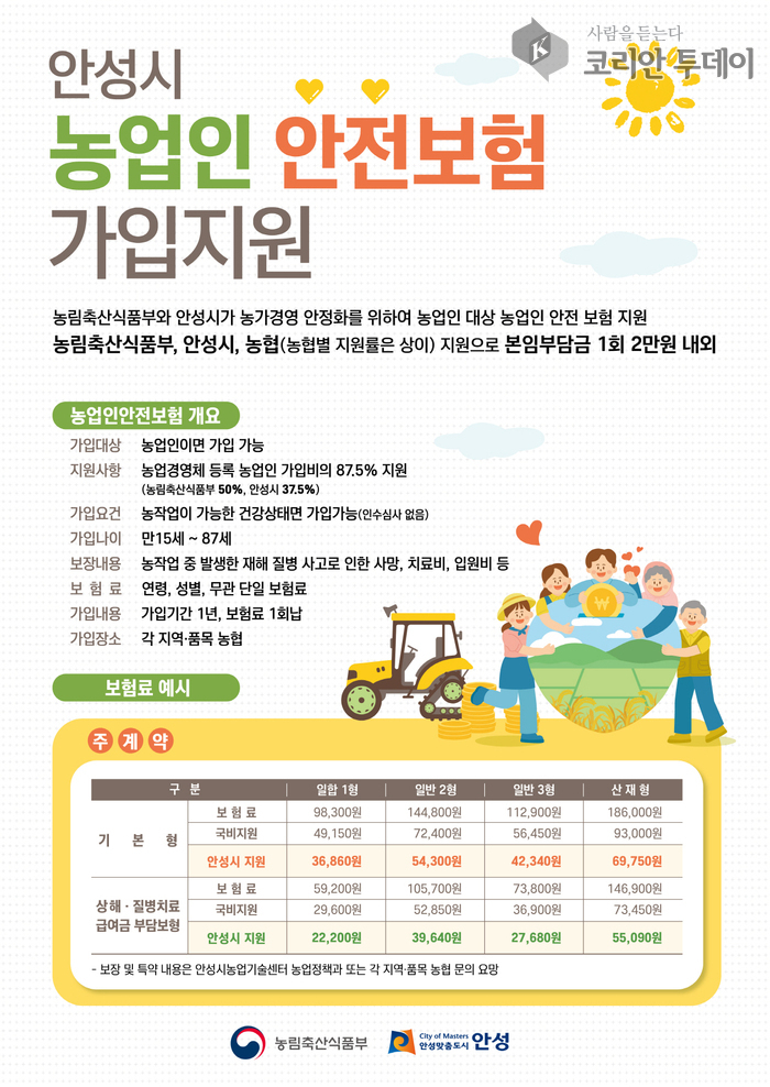 농작업 중 발생하는 재해를 보상하는 농업인 안전재해보험은 농업인 안전보험과 농기계 종합보험으로 구성되어 있으며, 농림축산식품부·경기도·안성시가 함께 추진하는 사업으로 보험료의 최대 87.5%까지 지원받을 수 있다.
