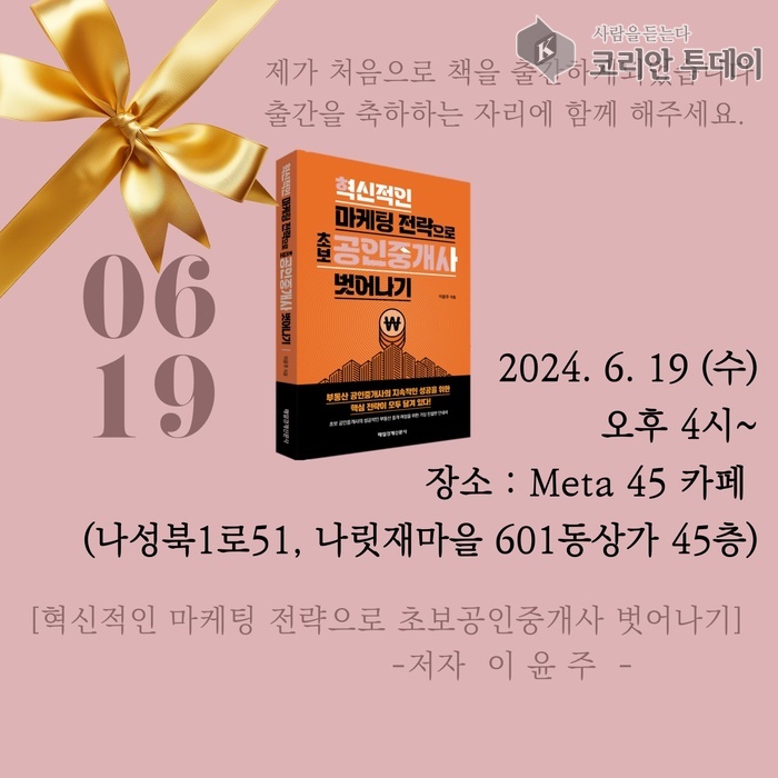 세종시, 2024년 6월 19일 – 이윤주 공인중개사 대표가 새로운 책 “혁신적인 마케팅 전략으로 초보공인중개사 벗어나기”를 출간하며, 이를 기념하기 위해 출판기념회를 개최한다. 이번 행사는 세종시 나성북로 1로 51, 나릿재마을 601동 상가 45층 META45 카페에서 오후 4시부터 진행될 예정이다.