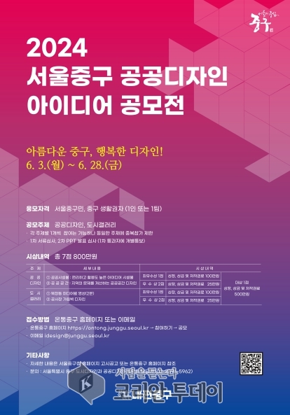 서울 중구는 오는 28일까지 “공공 디자인 아이디어 공모전”을 개최한다. 이번 공모전은 주민들이 직접 참여해 지역 문제를 해결하고 환경을 개선하는 데 목적이 있으며, 총 상금 500만 원과 저작권료, 구청장 표창이 수여된다.