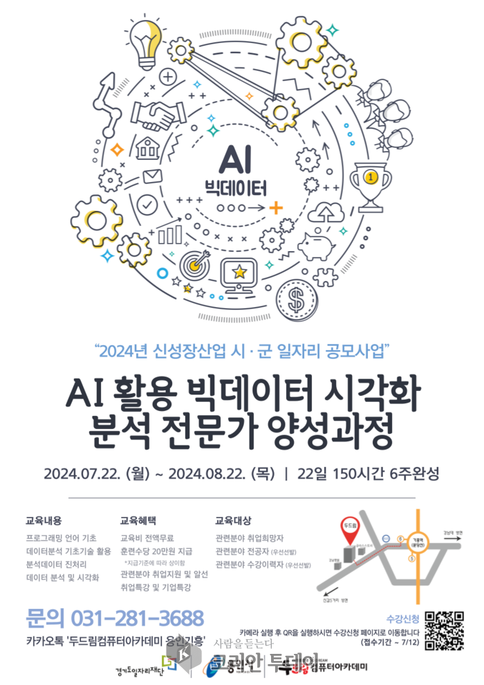 2024년 신성장산업 시군 일자리공모사업에서 주관하는 [AI활용 빅데이터 시각화 분석 전문가 양성과정]의 교육생 모집이 시작된다. 본 과정은 인공지능과 빅데이터를 활용한 분석 및 시각화 기술을 습득하고자 하는 교육생을 대상으로 한다.