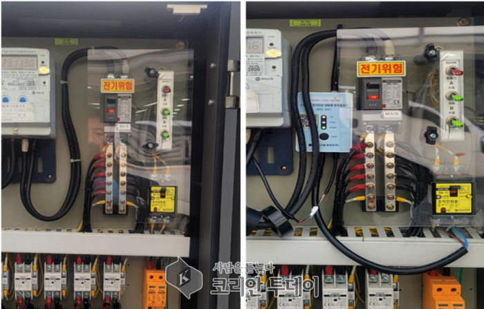 ![]() [코리안투데이] 가로등 분전함 내부 원격점검장치 설치 전(좌) 설치후(우) © 지승주 기자 |