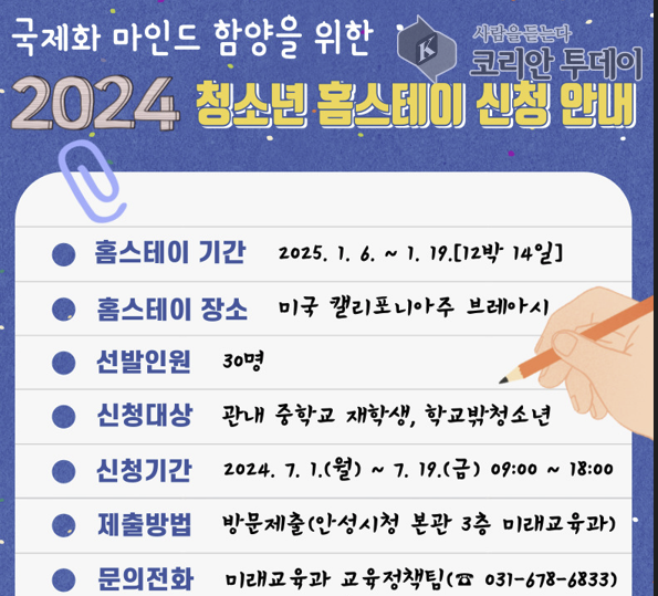 2024년 청소년 홈스테이 참가 신청은 오는 7월 1일 9시부터 7월 19일 18시까지 안성시청 본관 3층 미래교육과로 개별 방문 제출 방식으로 진행되며, 자세한내용은 안성시청 홈페이지에 공고되어 있다.