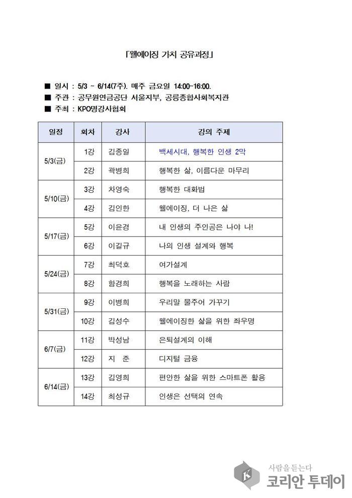 퇴직공무원 전문강사봉사단 양성과정이 공무원연금공단 서울지부가 후원하고 (사)KPO명강사협회의 주최하에 공릉종합사회복지관에서  5월 3일부터 6월14일까지 7주간 웰에이징 가치 공유과정 프로그램으로