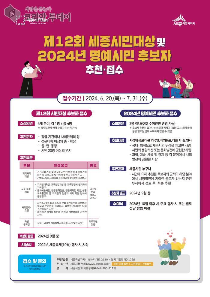 세종특별자치시(시장 최민호)가 지역사회 발전과 건전한 시민사회 조성에 공헌한 시민과 시정 발전에 기여한 명예시민을 찾습니다. 시는 6월 20일부터 7월 31일까지 ‘제12회 세종시민대상’과 ‘2024년 명예시민’ 후보자를 접수한다고 밝혔습니다.