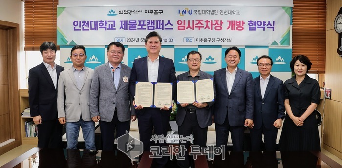 인천 미추홀구(구청장 이영훈)는 24일 구청장실에서 인천대학교(총장 박종태)와 ‘인천대학교 제물포캠퍼스 임시주차장 개방 협약식’을 체결했다.