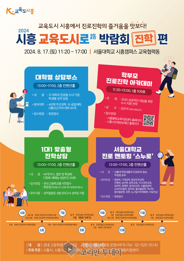시흥시(시장 임병택)는 시흥진로체험지원센터, 시흥시인재양성재단, 시흥교육지원청과 공동 주최로 8월 17일 11시 20분부터 17시까지 서울대학교 시흥캠퍼스 교육협력동에서 ‘2024년 시흥 교육도시로(路) 진학 박람회’를 개최한다.