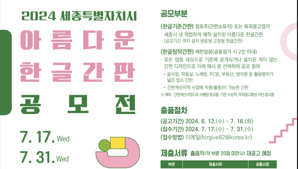 이번 공모전은 세종시의 정체성을 반영한 한글 간판을 통해 한글문화도시로서의 위상을 높이고, 품격 있는 도시경관을 조성하기 위해 마련됐다.