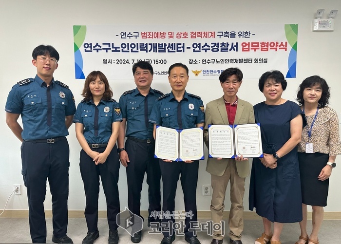 연수구(구청장 이재호)가 운영하는 노인인력개발센터가 지난 12일 연수경찰서와 노인일자리와 연계한 범죄예방 및 상호협력체계 구축을 위한 업무협약을 체결했다.