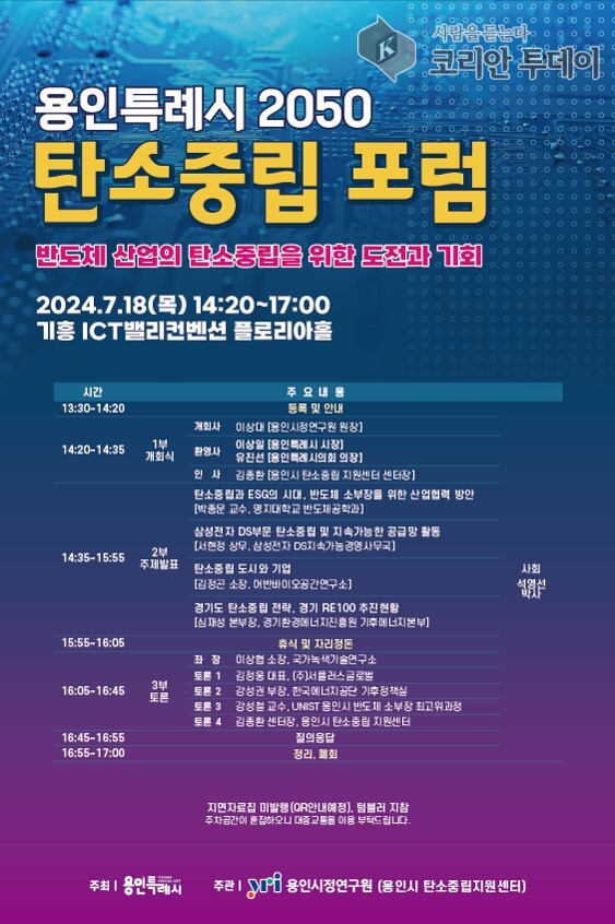 용인특례시는 2050 탄소중립을 목표로 하는 포럼을 7월 18일(목) 오후 2시 20분부터 5시까지 기흥 ICT밸리 컨벤션 플로리아홀에서 개최한다고 밝혔다. 이번 포럼은 반도체 산업의 탄소중립을 위한 도전과 기회를 주제로 다양한 관련 전문가들이 참여하여 심도 있는 논의를 펼칠 예정이다.