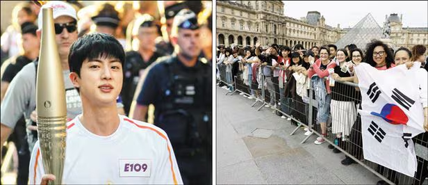 ![]() [Korean Today] K-POP influence Olympics··· BTS’s Jin Carrying the Olympic Torch to the Louvre Museum. On the 15th, BTS member Jin carried the 2024 Paris Olympic torch from Rivoli in Paris, France, to the front of the Louvre Museum, walking approximately 200 meters (left). Fans who had been waiting in advance welcomed him with Korean flags and signs written in Hangul.(Photo provided: News1·Reuters, Yonhap News, Chosun Ilbo) ⓒ Reporter Park Chan-doo |