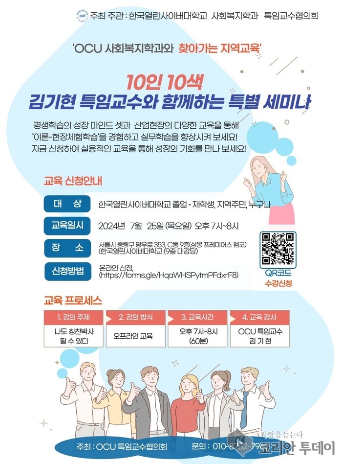 오는 7월 25일, 한국열린사이버대학교 사회복지학과와 특임교수협의회가 주최한 ‘찾아가는 지역교육‘ 프로그램의 일환으로 김기현 특임교수가 진행하는 특별 세미나가 서울 중랑구 망우로 한국열린사이버대학교 9층 대강당에서 열릴 예정이다.