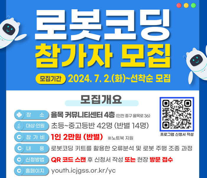 인천중구시설관리공단(이사장 손영식)은 중구청소년자유공간에서 ‘로봇 코딩 프로그램’의 참가자를 오는 7월 31일까지 선착순 모집한다고 밝혔다. 이번 프로그램은 참가자들에게 노트북을 제공하며, 로봇 키트를 활용한 오류 분석 및 주행 등의 기초 교육과 조종 과정을 통해 코딩에 대한 이해를 높이고, 창의적 문제 해결 능력을 배양하는 데 중점을 둔다.