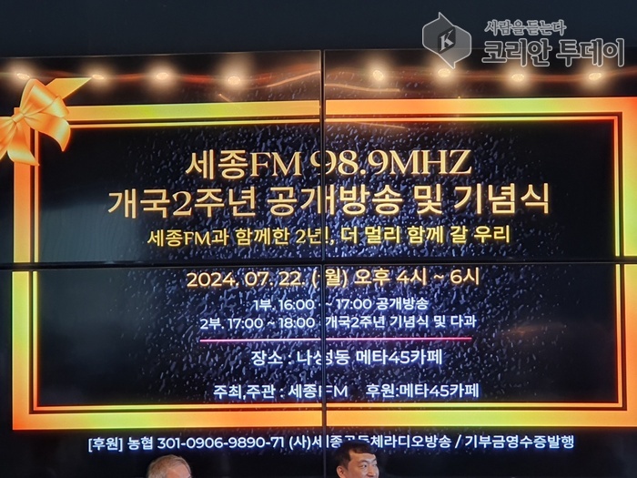 세종 FM 98.9MHz는 2024년 7월 22일 나성동 메타45 카페에서 대규모 공개 생방송 및 축하 행사로 2주년을 기념했다.