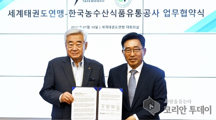 한국농수산식품유통공사(사장 김춘진)와 세계태권도연맹(총재 조정원)은 19일 세계태권도연맹 서울본부에서 저탄소 식생활 실천을 위한 업무협약을 체결하고, 국제올림픽위원회(IOC)에 보낼 저탄소 식생활 동참 건의 서신에 서명했다.
