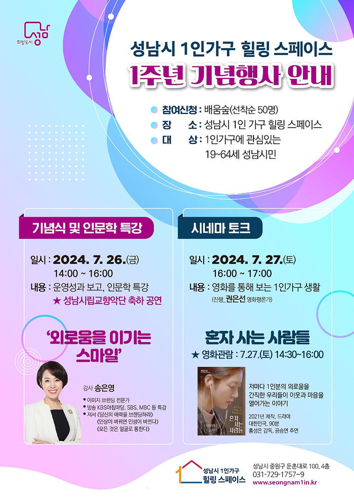 양일간 열리는 행사는 1인 가구에 관심 있는 19~64세 성남시민 누구나 참석할 수 있다. 성남시 평생학습 통합플랫폼 ‘배움숲’ 홈페이지를 통해서 기념식(35명), 인문학 특강(40명), 시네마 토크(40명) 등 행사별로 선착순 참여 신청이 가능하다.