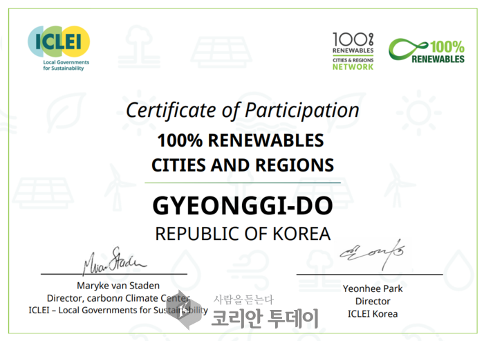![]() [코리안투데이] 경기도 100% 재생에너지 도시네트워크 가입인증서 © 강은영 기자 |