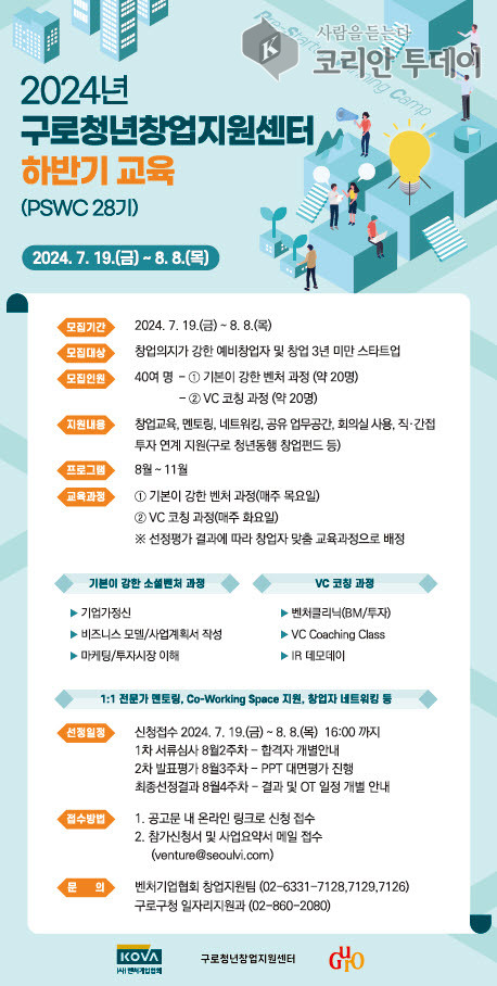 접수 기간은 8월 8일 오후 4시까지이며 신청을 원하는 (예비)창업자는 구청 또는 벤처기업협회 누리집을 통해 참가신청서 등 서류를 작성해 이메일로 제출해야 한다. 신청 서류 등 기타 자세한 사항은 구청 일자리지원과 및 벤처기업협회에 문의하면 된다.