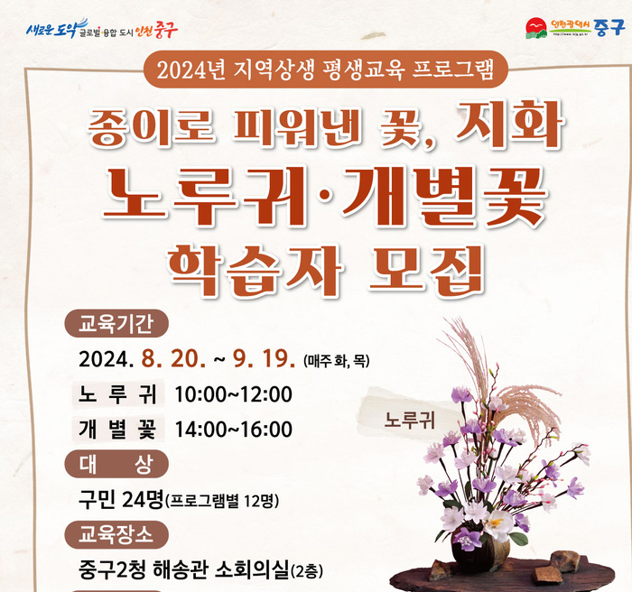 인천 중구(구청장 김정헌)는 지역 대표 전통 예술인 ‘지화(紙花) 공예’를 배워볼 수 있는 특별한 프로그램을 오는 8월 20일부터 9월 19일까지 운영한다고 밝혔다. 이번 프로그램은 중구 제2청 해송관 소회의실에서 열리며, ‘2024년도 지역 상생 평생교육’의 일환으로 진행된다.