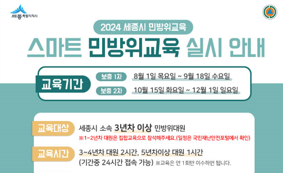 세종특별자치시(시장 최민호)는 민방위 사태 발생 시 즉각 대처 능력을 키우기 위해 8월 1일부터 9월 18일까지 2024년도 하반기 1차 민방위 사이버 및 집합교육을 실시한다. 1~2년차 대원은 4시간 집합교육에 참여하며, 3~4년차 대원은 2시간 사이버교육, 5년차 이상 대원은 1시간 사이버교육을 이수하면 된다.