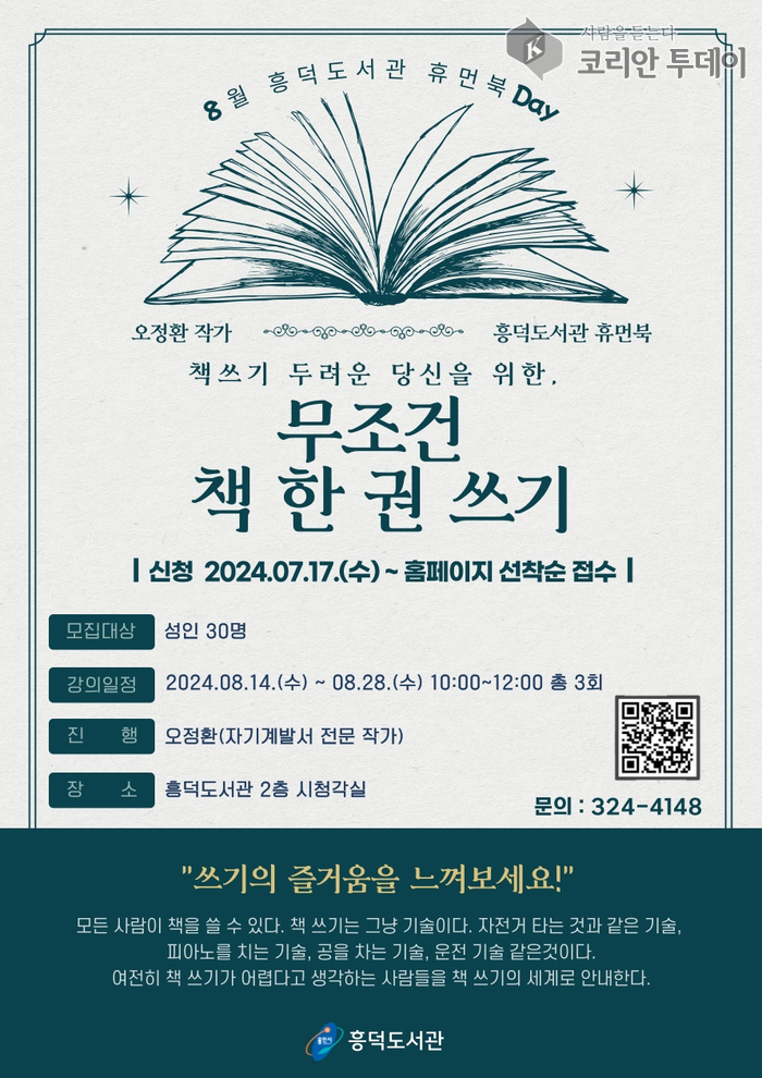 용인특례시는 8월 5일, 흥덕도서관에서 ‘무조건 책 한 권 쓰기’ 주제로 ‘휴먼북 데이’를 운영한다고 발표했다. 강연은 8월 14일부터 28일까지 매주 수요일 흥덕도서관 2층 시청각실에서 열린다.