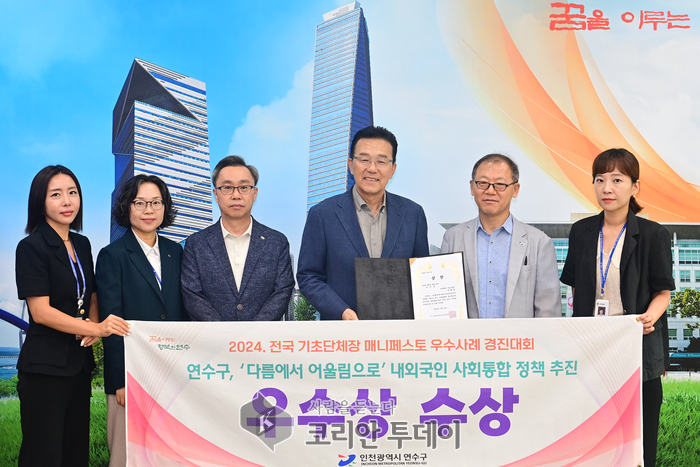 연수구(구청장 이재호)가 내외국인 상생을 위한 정책 제언으로 ‘2024 전국 기초단체장 매니페스토 우수사례 경진대회‘에서 사회적 불평등 완화 분야 우수상을 수상했다.