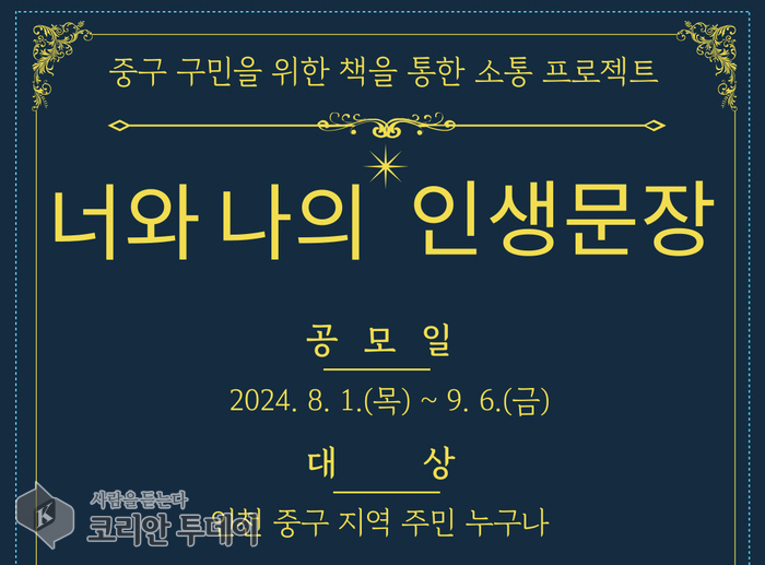 문화환경분과 관계자는 “책으로 마음의 양식도 채우고, 이웃과 관계도 돈독해질 수 있는 이번 공모전을 통해 중구 지역에 책 읽는 문화가 확산하기를 바란다”며 많은 참여를 당부했다.