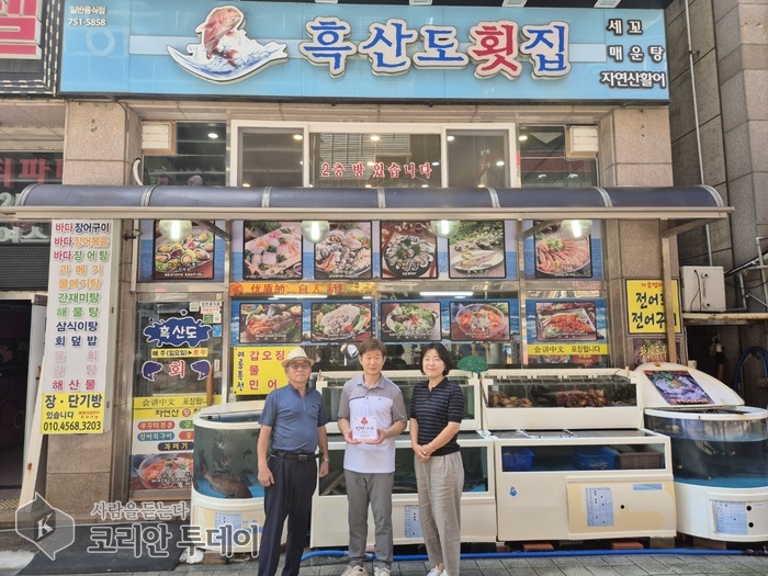 ![]() [코리안투데이] 착한가게 24호점 ‘흑산도회 식당’에 현판 전달하는 모습 © 김미희 기자 |
