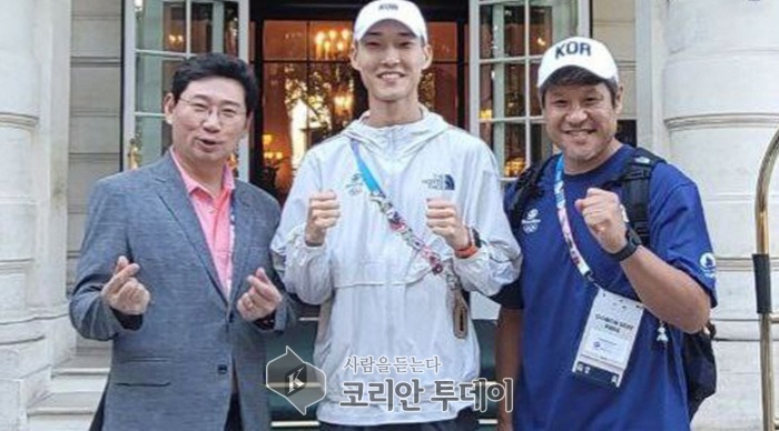 [코리안투데이] 이상일 용인특례시장은 11일 오전(프랑스 팔리 현지시각) 용인특례시 소속 우상혁 선수와 김도균 한국 육상 수직도약팀 코치와 조찬을 함께 하면서 우 선수의 다음 도전을 응원했다. © 김나연 기자