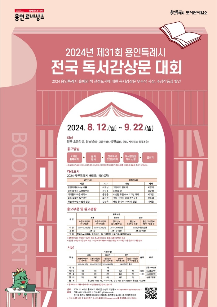 용인특례시는 2024년 제31회 전국 독서감상문 대회를 개최하며, 9월 22일까지 전국 국민을 대상으로 감상문을 접수받는다. 초등학생부터 성인까지 5개 부문에서 응모할 수 있으며, 11월 6일 수상작 28편을 발표하고 12월에는 수상작품집을 발간할 예정이다.