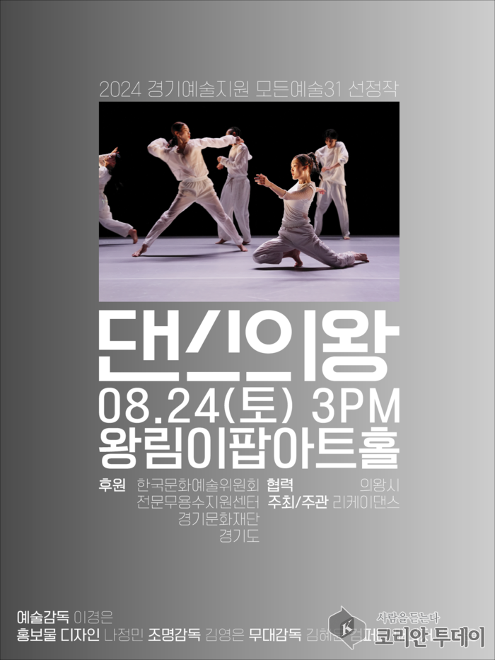 의왕시가 경기예술지원 ‘모든예술31’ 선정작으로 리케이댄스의 ‘댄스의왕’ 공연을 8월 24일 오후 3시 왕림이팝아트홀에서 개최한다. 리케이댄스는 2002년에 창단된 현대무용단으로, 이번 공연에서는 총 10명의 아티스트가 출동하여 ‘오롯이 나를 춤으로 만나는 순간’을 주제로 한 솔로 및 듀엣 갈라 무대를 선보일 예정이다.
