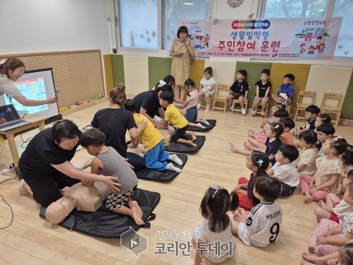 연수구(구청장 이재호)는 2024년 을지연습 연계 민방위 훈련으로 지난 21일 국공립레이크 2차 어린이집에서 어린이들의 응급상황 대처 능력을 강화하기 위한 생활밀착형 주민참여 훈련을 실시했다.