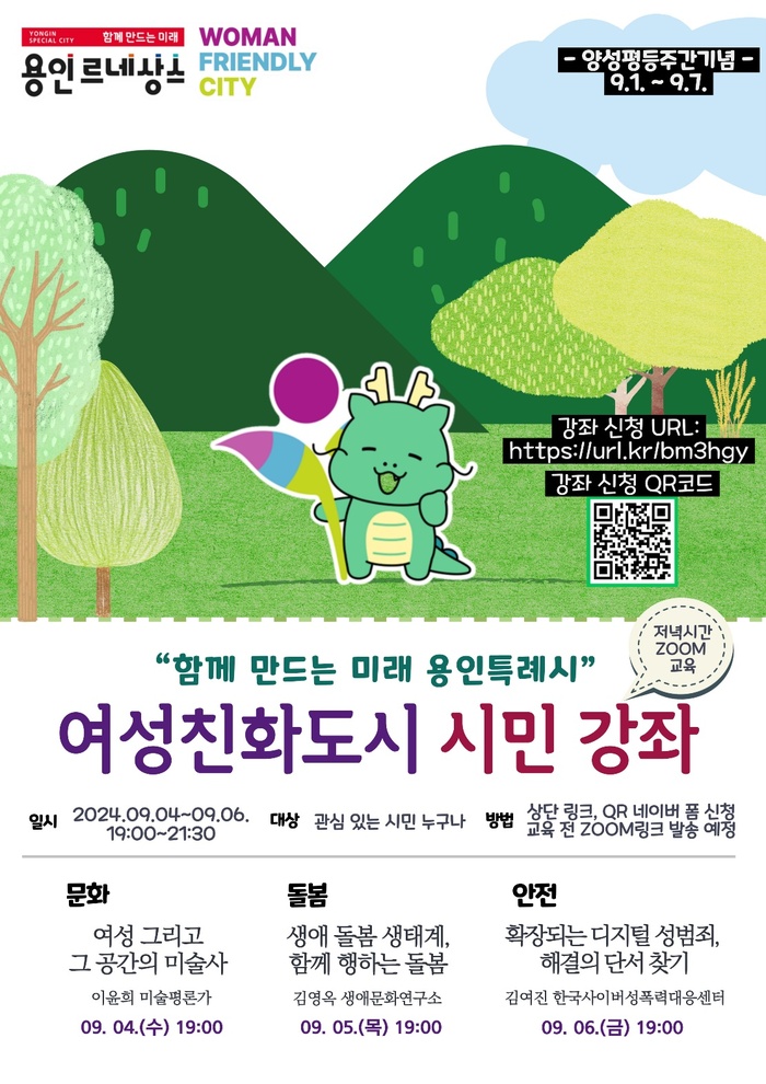 용인특례시는 9월 1일부터 7일까지 진행되는 양성평등주간을 맞아, 시민들이 여성친화도시의 의미를 깊이 이해할 수 있도록 ‘문화・돌봄・안전’을 주제로 한 시민강좌를 개최한다고 밝혔다. 이번 강좌는 9월 4일부터 6일까지 3일간 매일 저녁 7시부터 2시간 30분 동안 비대면으로 진행되며, ZOOM을 통해 용인시민 누구나 참여할 수 있다.