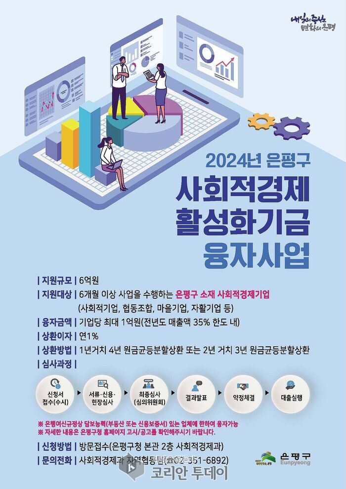 은평구(구청장 김미경)는 경기침체로 어려움을 겪고 있는 사회적경제기업 경제 활성화에 도움을 주고자 총 6억 원 규모로 ‘2024년 사회적경제활성화기금 융자사업’을 실시한다고 밝혔다.