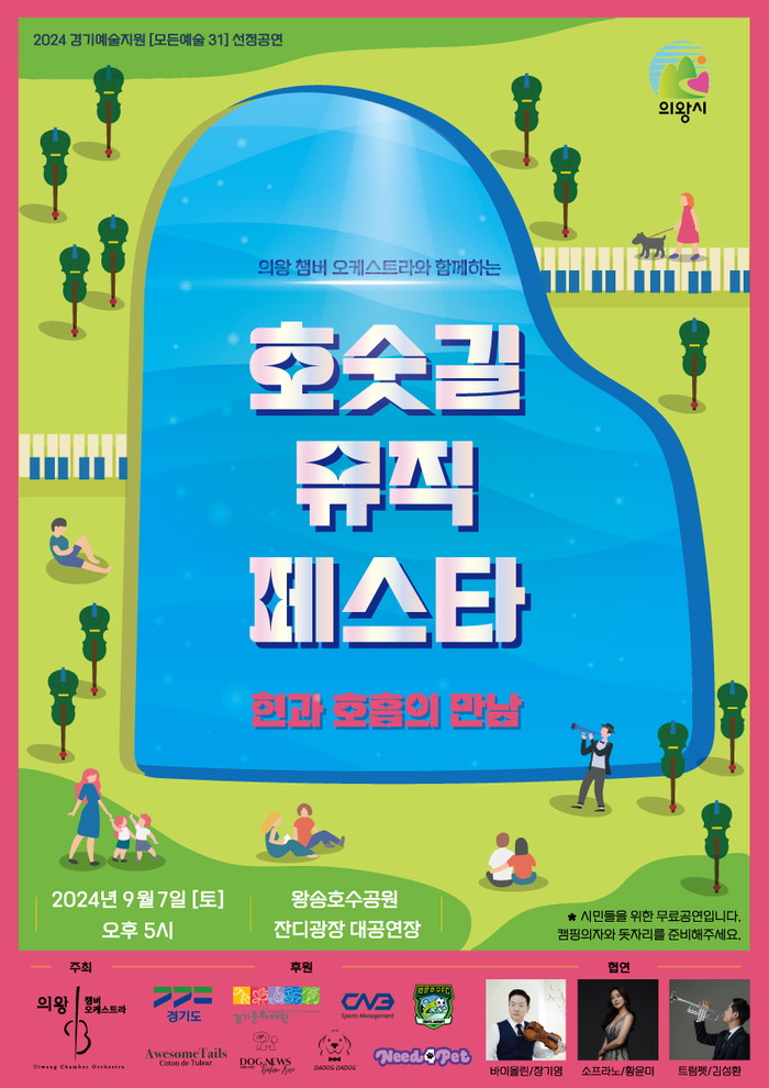 의왕 챔버 오케스트라(대표 차수진)는 오는 9월 7일 오후 5시, 의왕 왕송호수공원 잔디광장에서 ‘호숫길 뮤직 페스타 2 – 현과 호흡의 만남’을 개최한다고 밝혔다. 이번 공연은 작년 시즌 1의 성공적인 개최에 힘입어 한층 더 풍성한 프로그램으로 시민들에게 다가간다.