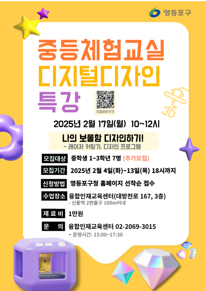 영등포구가 오는 2025년 2월 17일 월요일, 중학생 1~3학년을 대상으로 ‘디지털 디자인’ 특강을 개최한다고 밝혔다. 이번 특강은 오전 10시부터 12시까지 진행되며, 디지털 디자인의 기초를 배우고 레이저 커팅기를 활용한 실습을 통해 학생들의 창의력을 키우는 데 중점을 두었다.