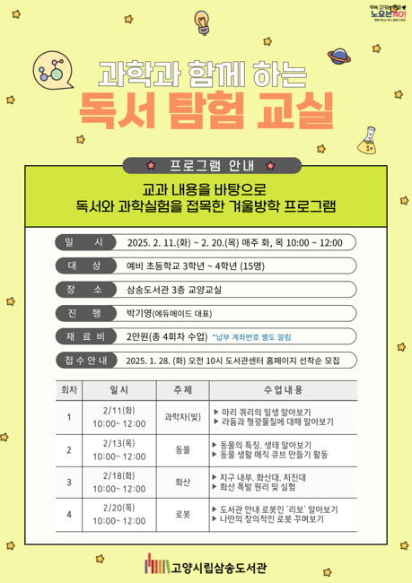 고양특례시 삼송도서관이 겨울방학을 맞아 과학과 독서를 접목한 특별 프로그램 ‘과학과 함께 하는 독서 탐험 교실’을 운영한다.