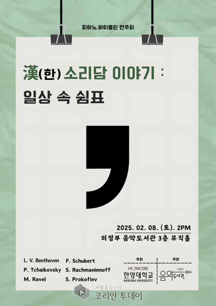 이번 공연은 2025년 새해를 맞는 ‘희망’과 ‘즐거움’을 담아 2월 8일 오후 2시, 음악도서관 3층 뮤직홀에서 펼쳐질 예정이다. 피아노와 바이올린 선율을 통해 베토벤, 슈베르트, 차이코프스키 등 대중에게 친숙한 연주곡을 감상할 수 있다.
