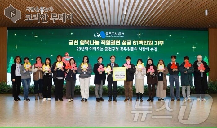 서울 금천구는 30일, 공무원들이 자발적으로 기부한 6000만 원의 성금을 ‘2025 희망온돌 따뜻한 겨울나기’ 사업에 전달했다고 밝혔다. 이는 공무원들이 매월 일정 금액을 기부하는 ‘금천 행복나눔 직원결연 사업’을 통해 마련된 것으로, 매년 6000만 원 이상 기부가 이어지고 있다.