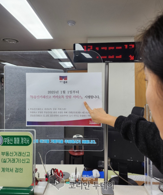 종로구(구청장 정문헌)가 지난달부터 ‘부동산거래신고 카카오톡 서비스’를 시행해 주민들의 긍정적인 반응을 얻고 있다. 부동산 매매, 증여, 분양권 등 각종 거래 신고를 접수한 후 5일 이내에 거래 당사자(매도인, 매수인)에게 처리 결과 및 소유권 이전 등기 의무 사항을 카카오톡 알림톡으로 안내하는 서비스다.