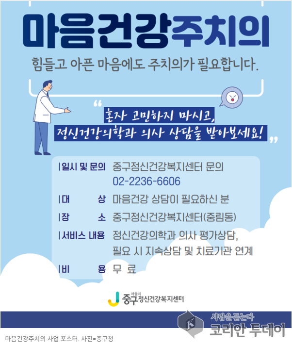 김길성 중구청장은 “몸이 아플 때 병원을 찾는 것처럼, 힘들고 아픈 마음에도 주치의가 필요하다”라며 “이번 사업을 통해 많은 주민들이 전문적인 상담을 받고 더 건강하고 행복한 삶을 누릴 수 있기를 바란다”라고 밝혔다.