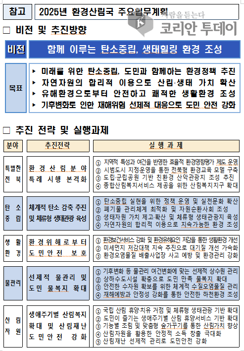 ![]() [코리안투데이] 전북특별자치도 환경산림국 2025년도 주요업무계획 ©강정석 기자 |