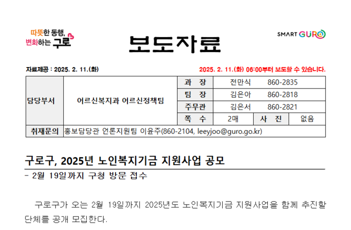 ![]() [코리안투데이] 사진 구로구 언론팀 제공 구로구 2025년 노인복지기금 지원사업 공모© 박수진 기자 |