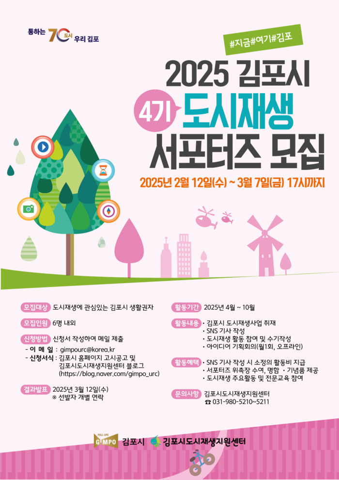 모집과 관련한 자세한 내용은 김포시 홈페이지 고시공고 또는 김포시 도시재생지원센터 블로그(blog.naver.com/gimpo_urc)에서 확인할 수 있으며, 문의는 김포시 도시재생지원센터(031-980-5211)로 하면 된다.