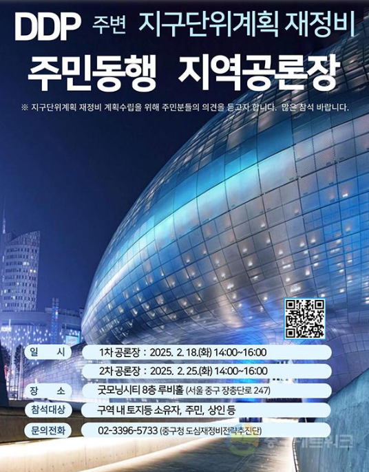 서울 중구(구청장 김길성)가 동대문디자인플라자(DDP) 일대의 도시 경쟁력을 높이기 위해 주민과 함께하는 ‘지구단위계획 재정비’에 나선다. 이를 위해 오는 2월 18일과 25일, 광희동 굿모닝시티에서 ‘주민동행 지역공론장’을 운영한다.